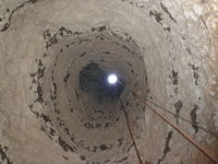 Puits de marnière, observé depuis le fond. On constate un niveau d'exploitation supérieur et de nombreux bancs de silex. Ancretteville-sur-Mer (76).