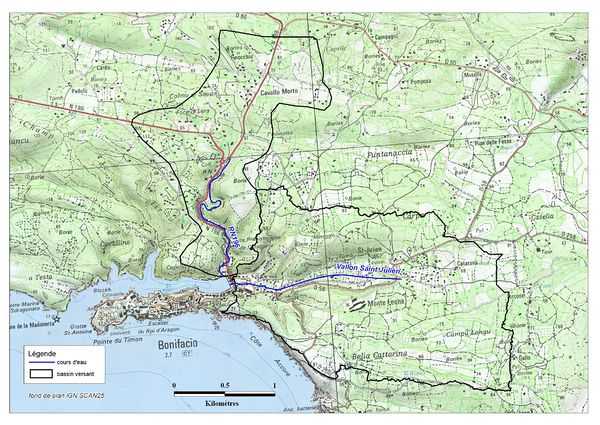 Au vue de la topographie du terrain, et sans qu’il soit besoin d’une analyse hydrogéologique plus poussée, on peut considérer que ces trois sous bassins ne contribuent pas à la réponse hydrologique en crue du Saint Julien au niveau du port de Bonifacio. La surface de ces bassins, qui représente 18 ha sur les 40 ha du bassin total, ne sera pas prise en compte pour l’estimation d’un débit de crue.