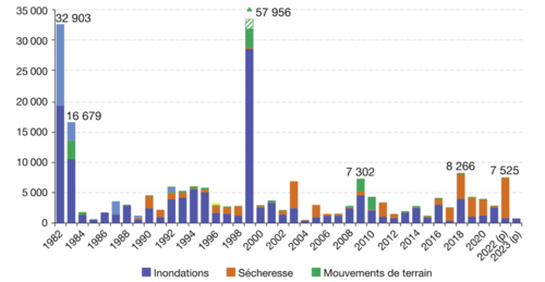 Au total, entre la date de création du régime d’indemnisation des risques de catastrophes naturelles en 1982 et la fin 2023, le coût des différents périls couverts par le régime d’indemnisation de ces catastrophes s’élève à 51,5 milliards d’euros (Md€), soit en moyenne 1,34 Md€ par an.